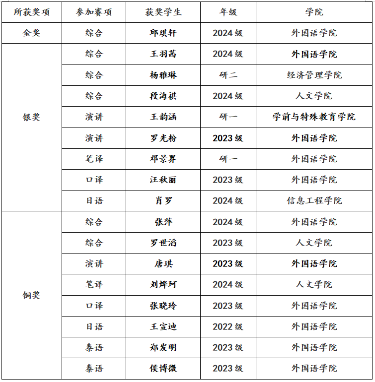昆明学院共有17名选手参加了本次大赛,与来自云南省其他33所高校的优秀选手同台竞技。在本次大赛中,我校学生表现优异,在英语组四项赛事(综合、演讲、笔译、口译)和多语种组两项赛事(泰语、日语)中共获金奖1项、银奖8项、铜奖8项,荣获金奖的同学将代表云南省参加11-12月的全国赛。