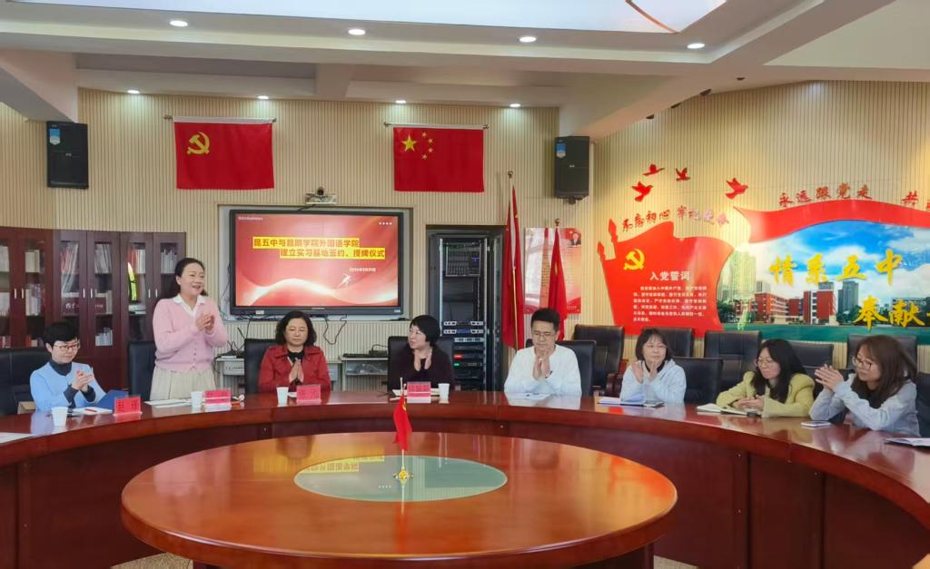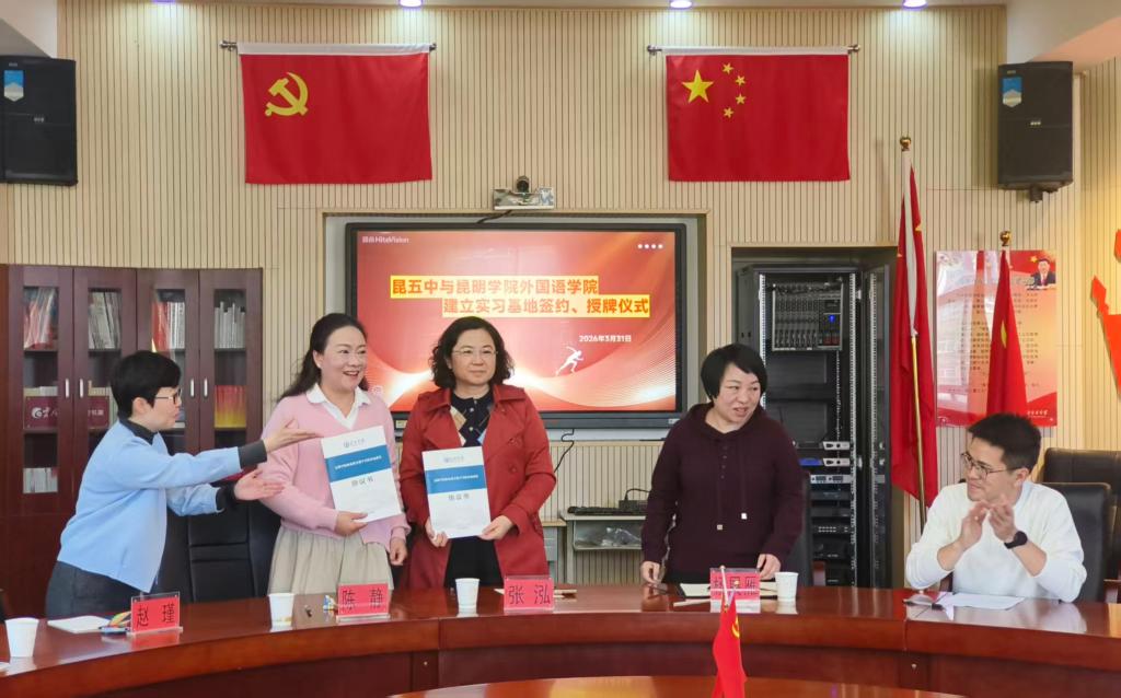 2026年3月31日上午,昆明学院外国语学院与昆明市第五中学实习基地签约暨授牌仪式在昆五中党员活动室举行。此次仪式是两校深化教育合作、践行协同育人理念的体现,为高校与中学联动育人搭建平台,为培育英语教育人才、推动区域教育发展奠定基础。