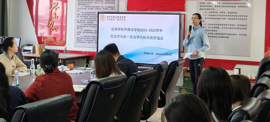 2025年10月9日,外国语学院在博文楼2502会议室召开了2024-2025学年校级优良学风班、优良学风标兵班评审推荐会。外国语学院党委副书记翟喆、副院长赵瑾、全体辅导员、班主任、部分专任教师出席评审会。通过中期核验的16个班级具备评审推荐资格,依据各班级提交的2024-2025学年班级工作台账,评审成员审阅台账后投票进行评审推荐。