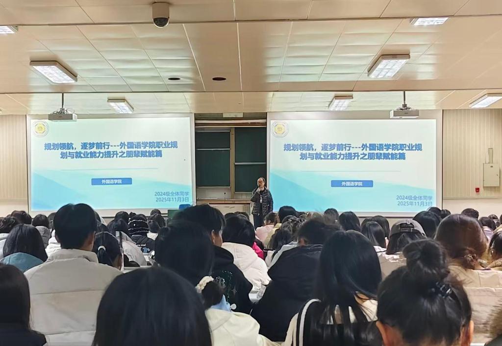 为进一步提升学生职业规划能力,精准赋能学生成长,2025年11月3日,外国语学院“规划领航,逐梦前行”职业规划与就业能力提升之朋辈赋能活动分别在博识楼2001、2003教室顺利举行。本次活动由各年级辅导员主持,党委副书记翟喆出席,2024、2025级全体同学参加。